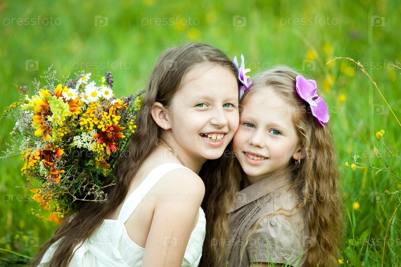Две девочки с букетами полевых цветов
