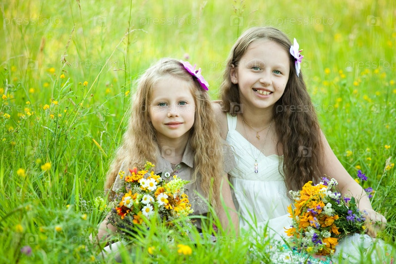 Две девочки с букетами полевых цветов сидят на лужайке