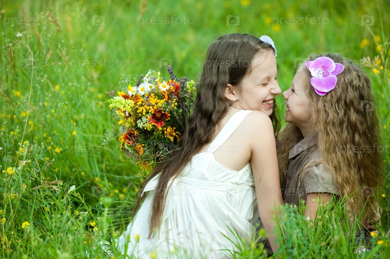 Две девочки с букетами полевых цветов сидят на лужайке