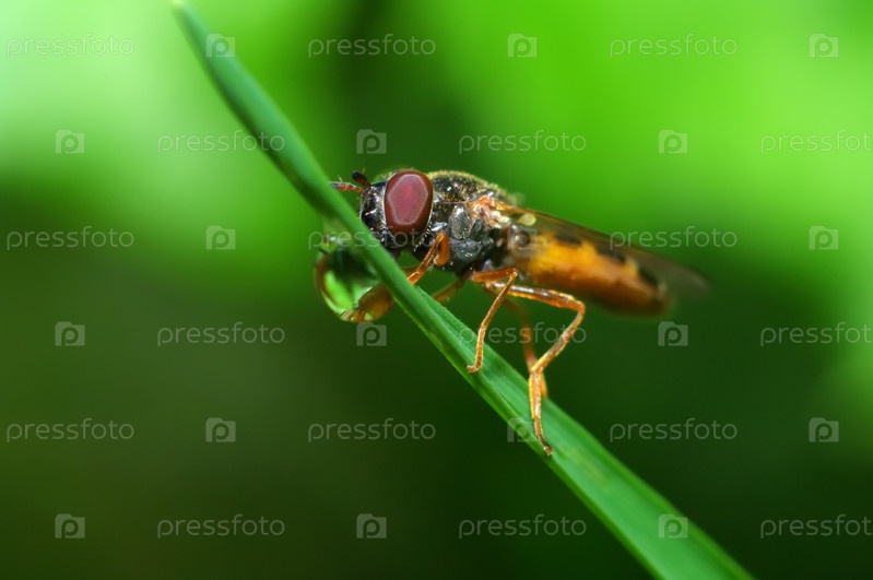 Муха пьет росу на травинке