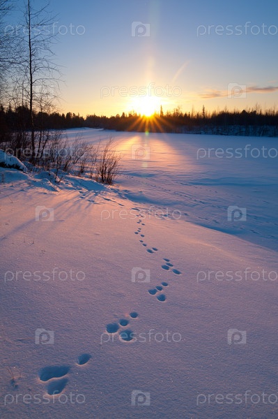 Красивый зимний вечер на природе, следы зверя на снегу