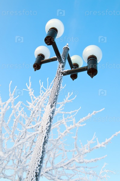 Фонарь на фоне заснеженного дерева