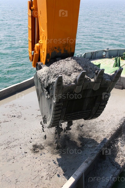 Экскаватор грузит почву с морского дна на баржу
