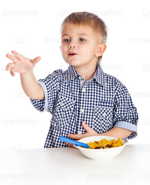 Мальчик с миской кукурузных хлопьев на белом фоне