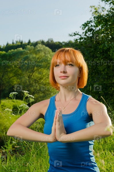 Красивая рыжеволосая женщина практикует фитнес-йогу на открытом воздухе