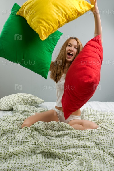 Красивая молодая женщина в нижнем белье на кровати с подушками