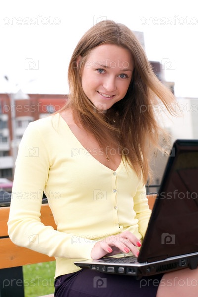 Девушка сидит на скамейке с ноутбуком