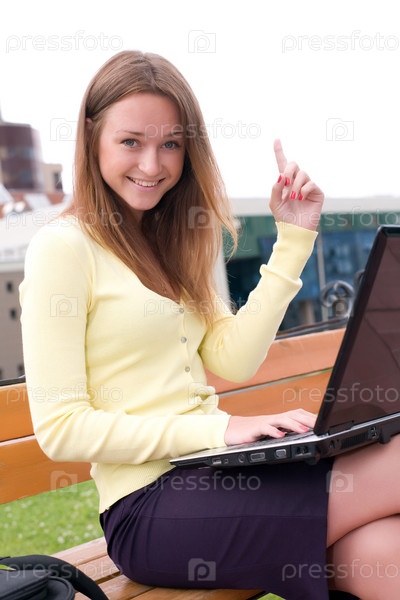 Девушка сидит на скамейке с ноутбуком