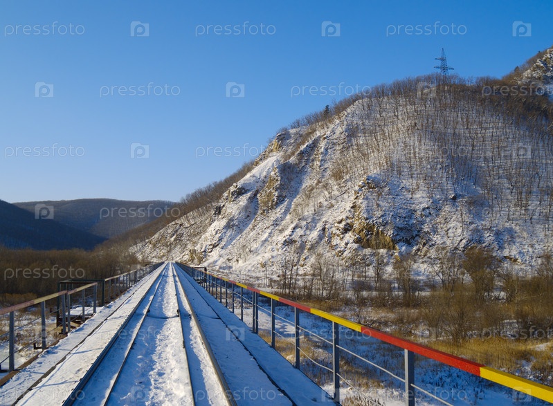Зимний пейзаж с железнодорожным мостом на горном склоне