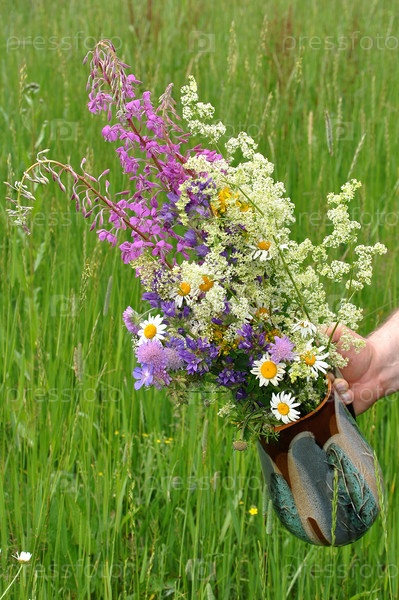 Ваза с полевыми цветами в руке на фоне зеленой травы