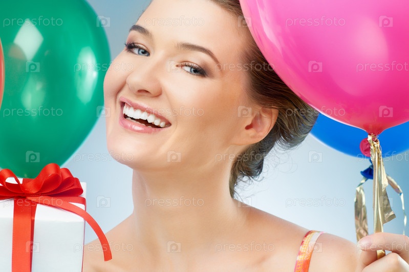 Счастливая девушка с подарком и воздушными шарами