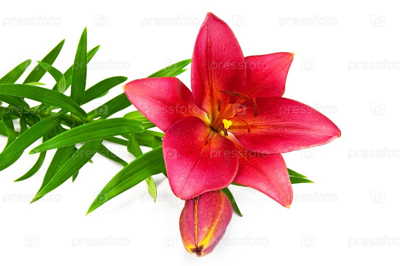 Красная лилия с зелеными листьями на белом фоне
