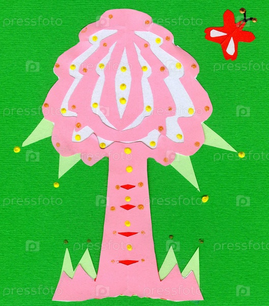 Розовое дерево с бабочкой на зеленом фоне