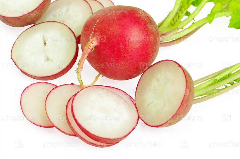 Нарезанный свежий редис на белом фоне