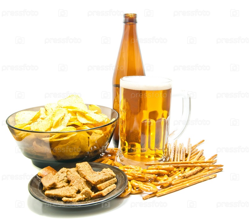 Закуски и пиво на белом фоне