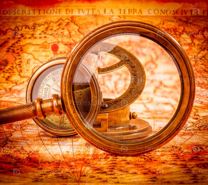 Увеличительное стекло лежит на карте древнего мира