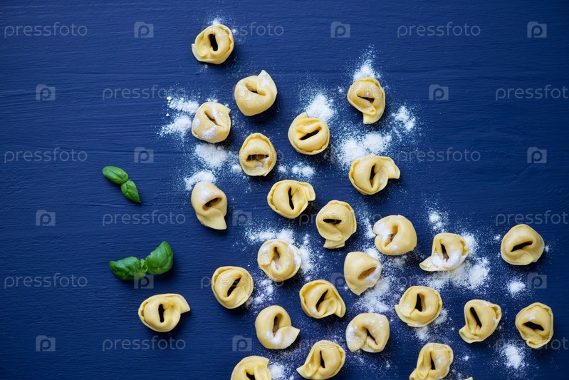 Сырые тортеллини на темно-синем фоне