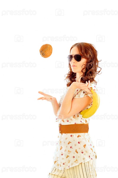 Женщина в солнцезащитных очках с тропическими фруктами, белый фон
