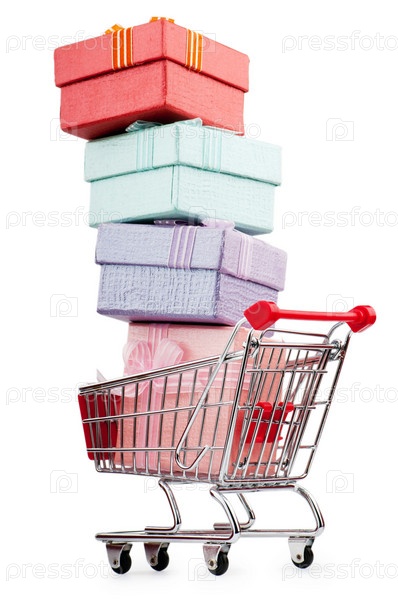 Тележка с подарками на белом фоне