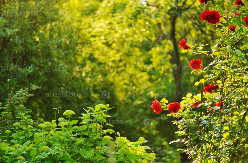 Куст цветущей красной розы в летнем саду