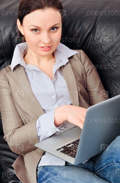 Портрет молодой женщины, сидящей с ноутбуком на диване
