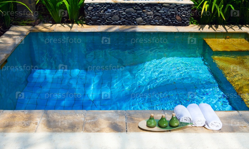 Полотенца и средства для спа-ухода на краю бассейна
