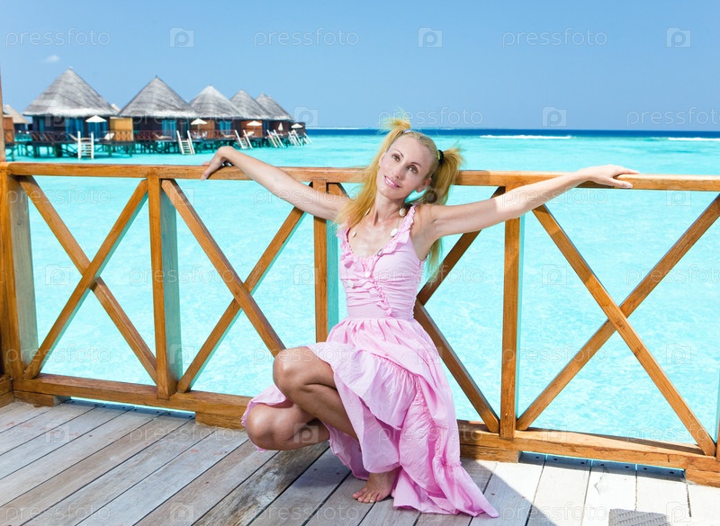 Молодая красивая женщина в розовом сарафане на платформе виллы на воде, Мальдивские острова
