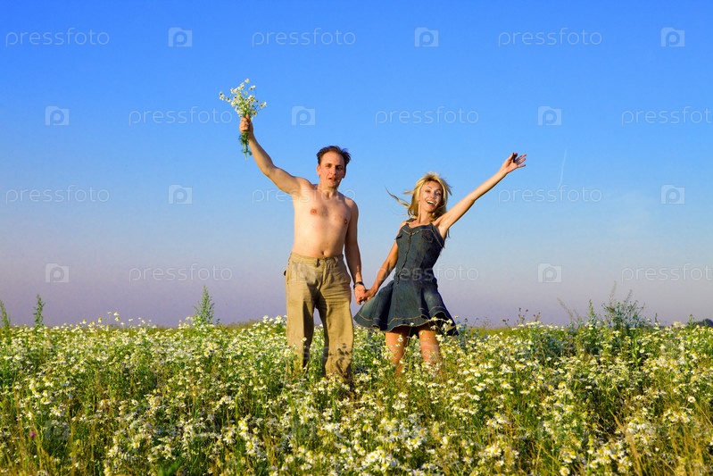 Счастливая молодая пара в поле