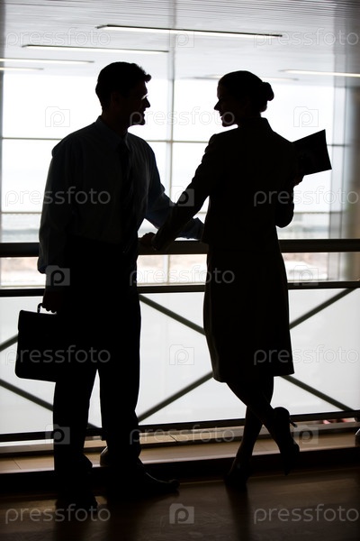 Силуэты двух бизнесменов, стоящих на балконе и смотрящих друг на друга с улыбкой