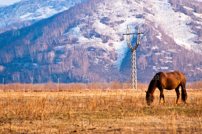 Лошадь пасется в осеннем поле на фоне снежных гор