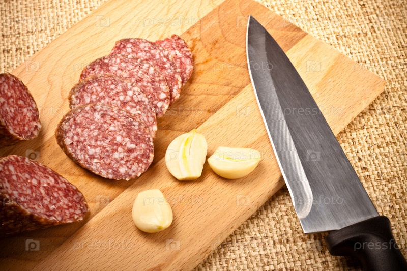 Сосиски, чеснок и нож на режущей доске