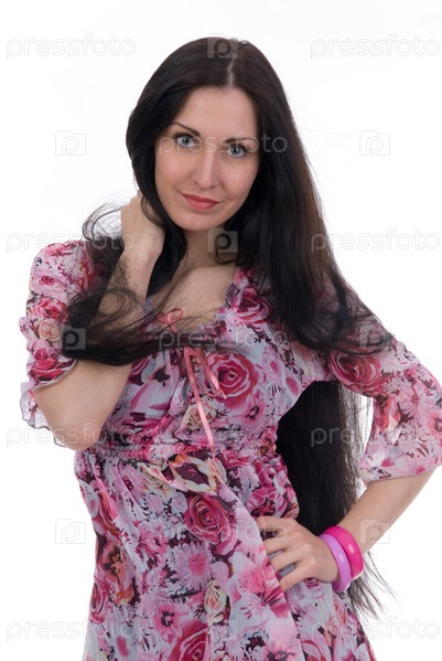 Стройная брюнетка с длинными волосами в цветастом легком платье, на белом фоне