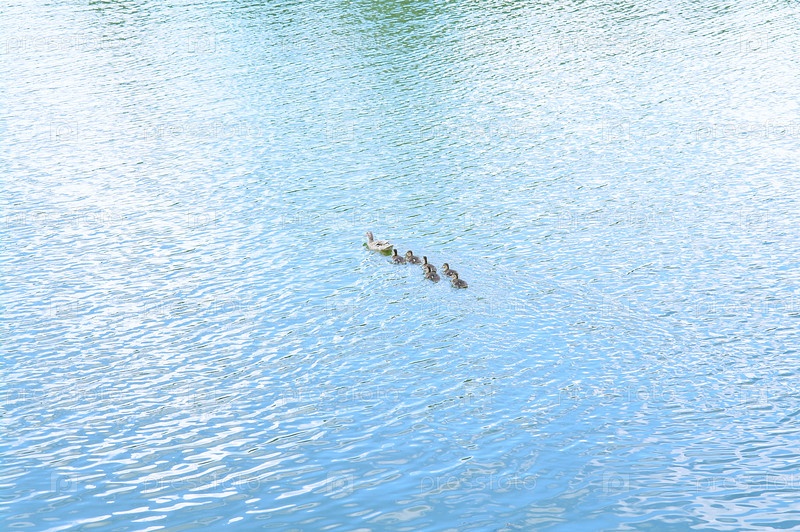 Утка с утятами на озере летом, Кузьминки, Москва