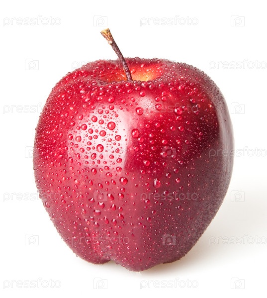 Красное яблоко с каплями воды на белом фоне