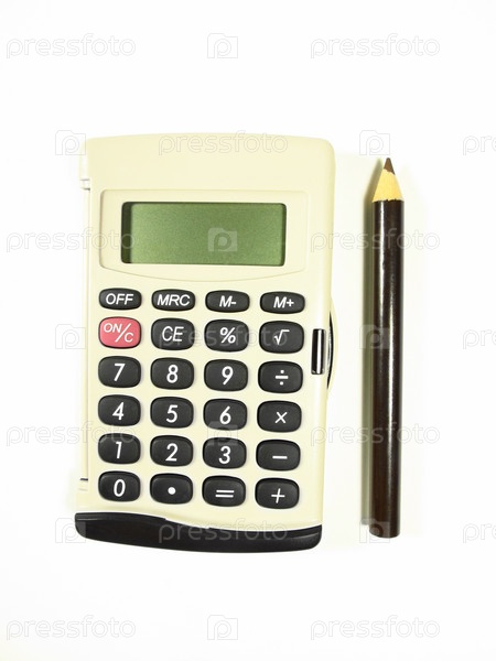 Калькулятор и карандаш на белом фоне