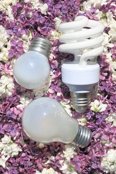 Энергосберегающая и обычная лампочка на фоне цветов сирени