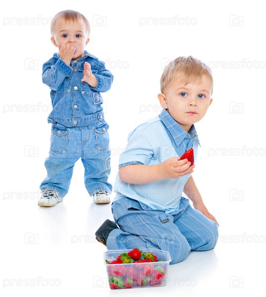 Два маленьких мальчика едят клубнику на белом фоне