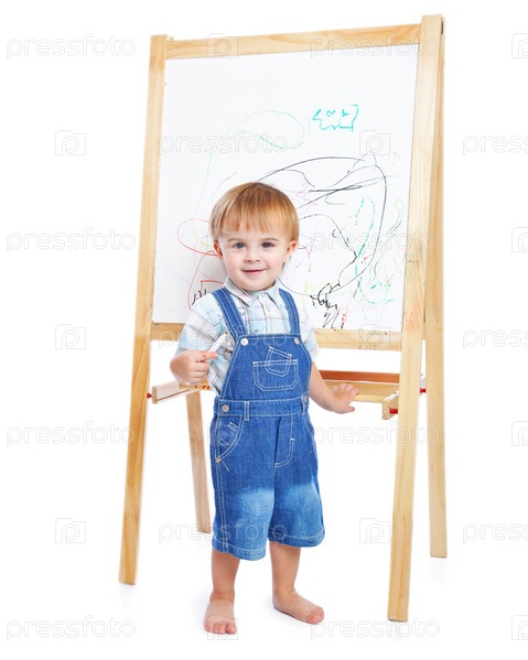 Маленький мальчик рисует маркером на доске, белый фон