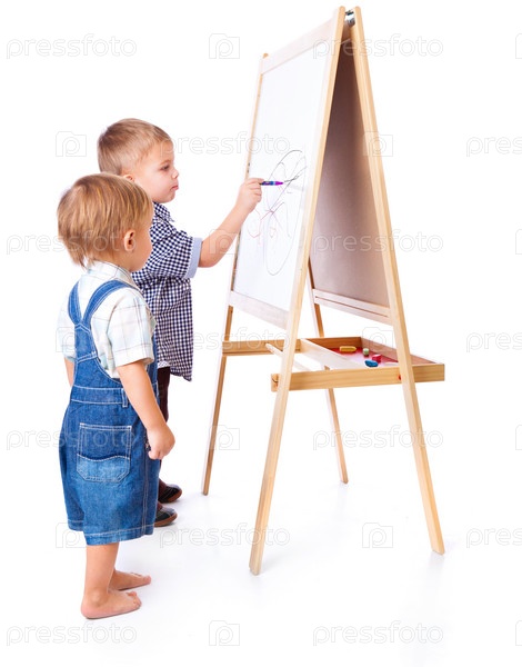Два маленьких мальчика рисуют маркерами на доске, белый фон