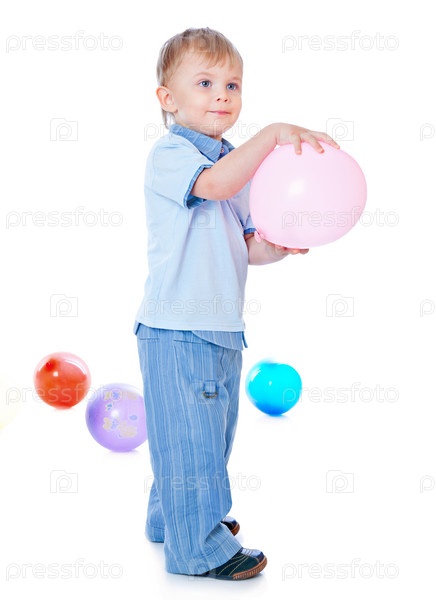 Маленький мальчик с воздушными шарами на белом фоне