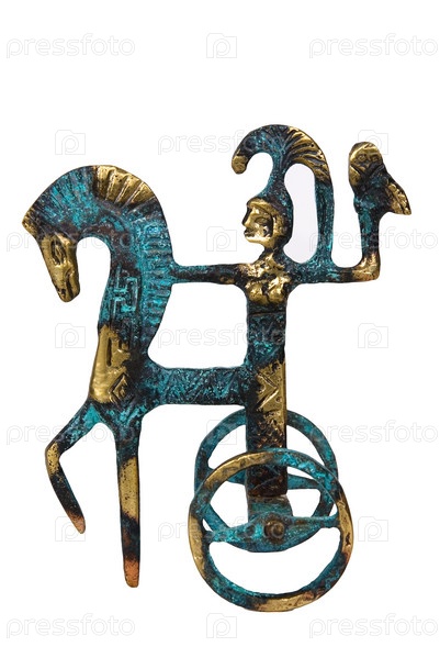Старинная металлическая статуэтка наездницы в колеснице изолирована на белом