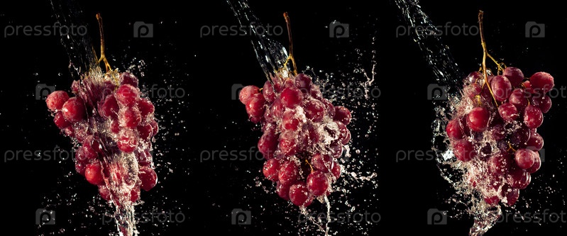 Гроздья красного винограда в брызгах воды на черном фоне