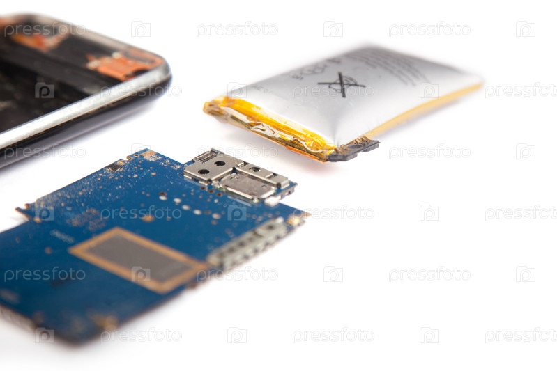 Смартфон в разобранном виде крупным планом, изолированный на белом фоне