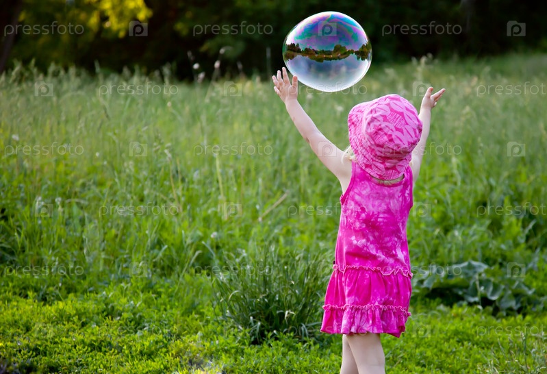 Маленькая девочка играет с мыльным пузырем на природе