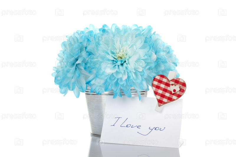 Синие хризантемы в горшочке с любовной запиской и сердечком на белом фоне