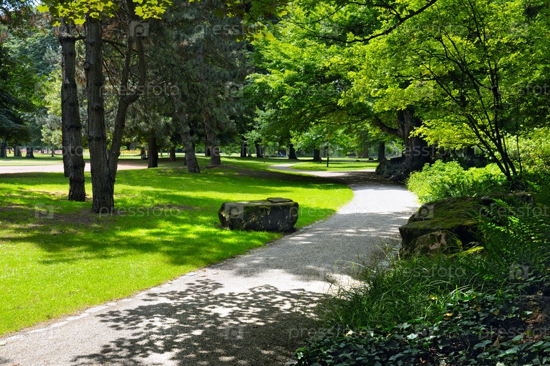 Летний парк с зелеными газонами