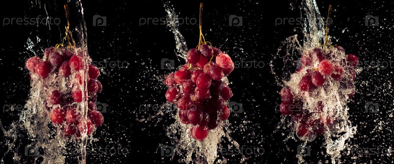 Гроздь винограда под струей воды на черном фоне