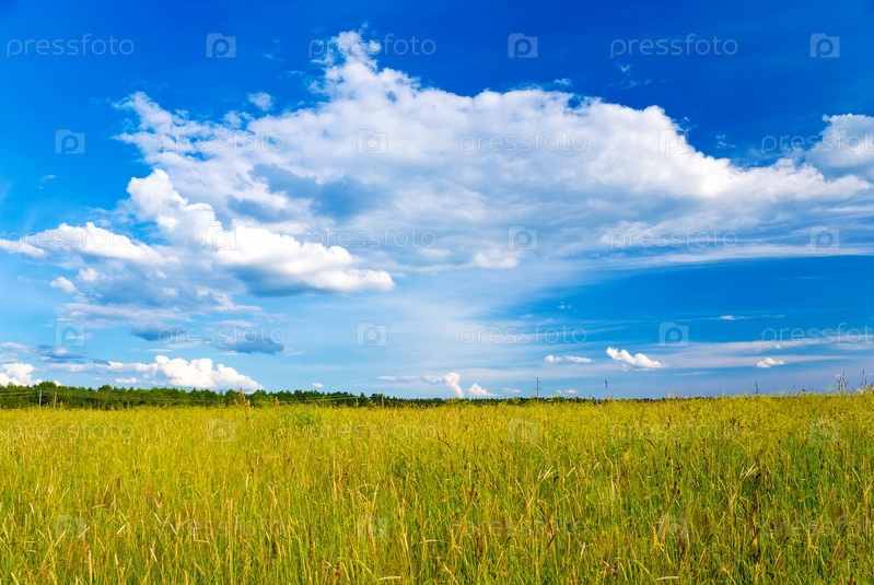 Летнее поле с высокой желтой травой и голубым небом с большим белым облаком