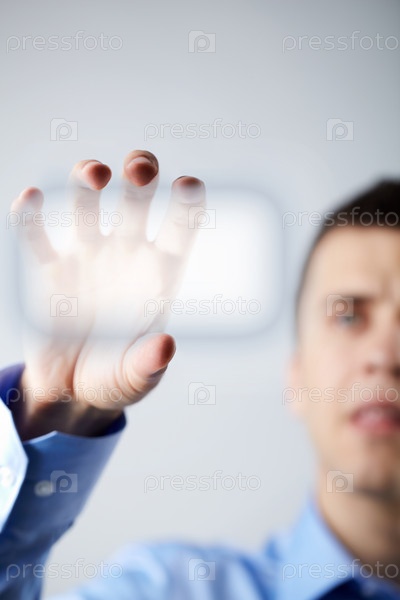 Молодой деловой мужчина нажимает на сенсорную кнопку