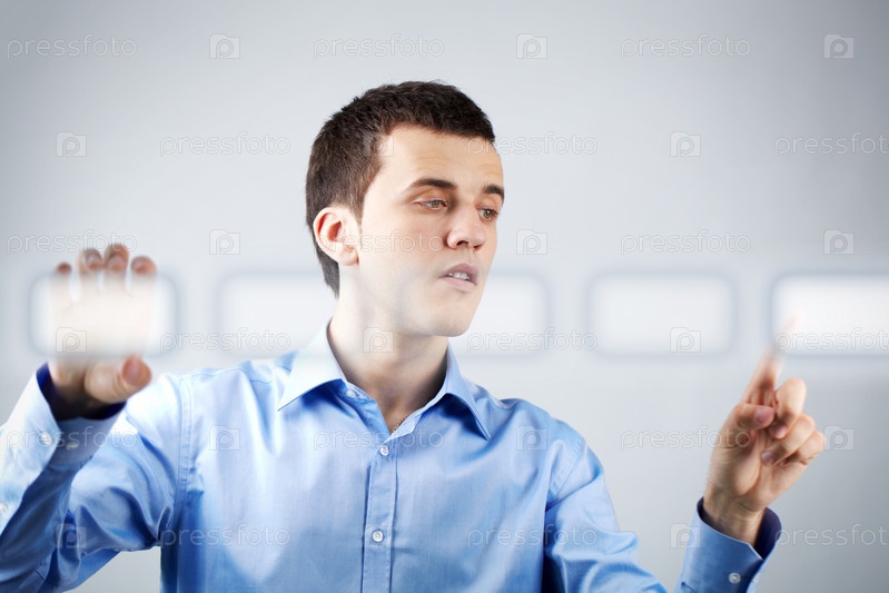 Молодой деловой мужчина нажимает на сенсорную кнопку